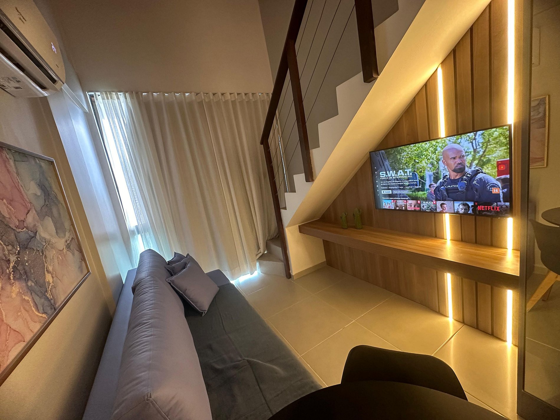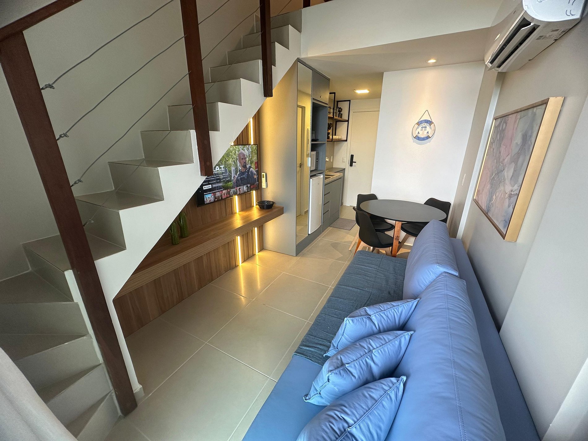 O resort oferece uma área de lazer com piscinas, coworking, brinquedoteca, salão de jogos, academia de ginástica e Spa. O apartamento está todo finamente mobiliado.