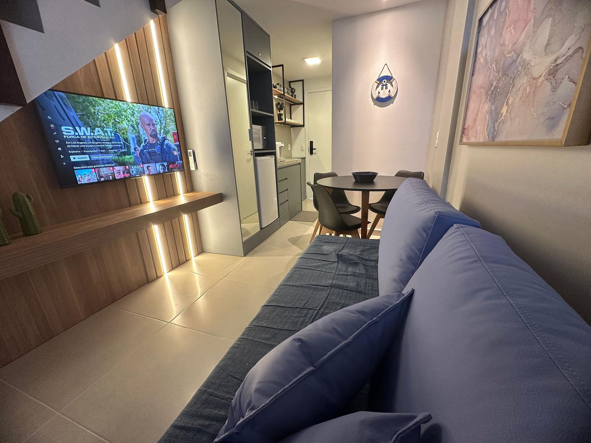 O resort oferece uma área de lazer com piscinas, coworking, brinquedoteca, salão de jogos, academia de ginástica e Spa. O apartamento está todo finamente mobiliado.